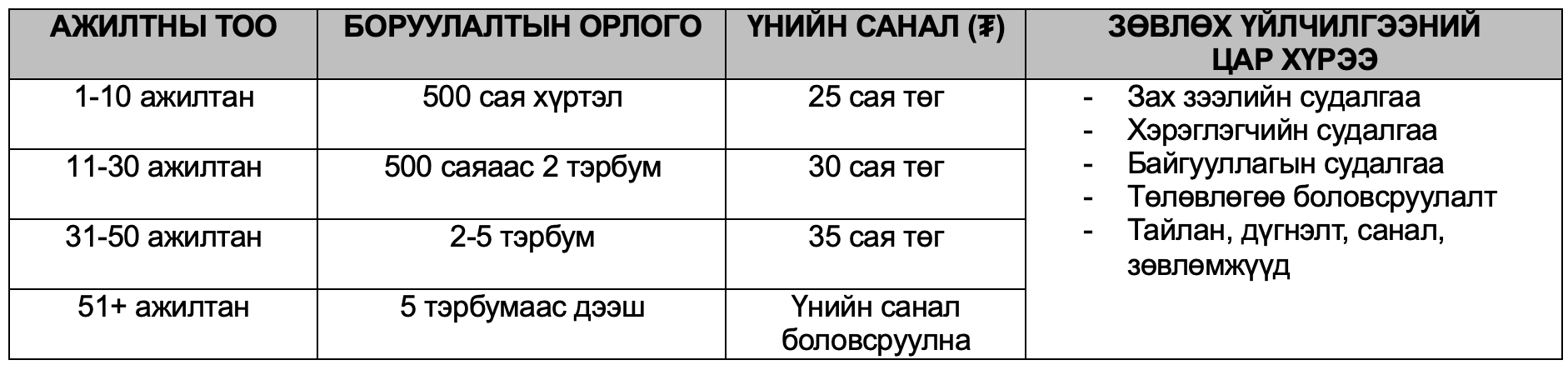 *Бизнесийн үйл ажиллагааны чиглэл нэмэгдэх бол үнийн саналд нэмэлт өөрчлөлт орно.